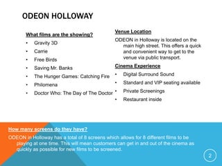 The Odeon Holloway has 8 screens showing films such as Gravity 3D, Carrie, Free Birds, Saving Mr. Banks, The Hunger Games: Catching Fire, and Philomena. It is located on the main high street near public transport. The venue offers digital surround sound, standard and VIP seating, private screenings, and a restaurant.