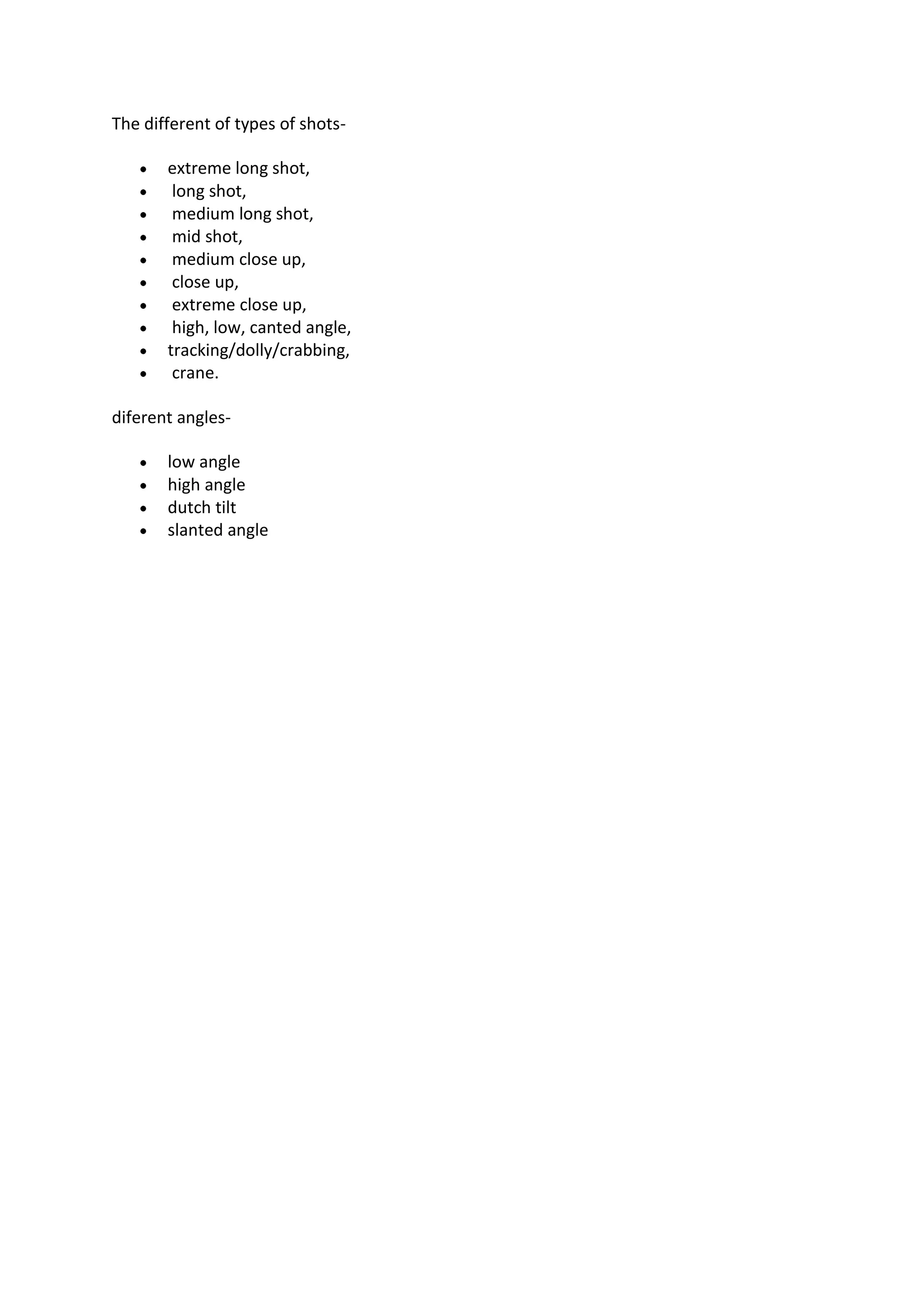 This document outlines various camera shots and angles used in filmmaking including extreme long shots, long shots, medium long shots, mid shots, medium close ups, close ups, extreme close ups as well as high, low and canted angle shots. It also mentions tracking, dolly, crabbing and crane camera movements and describes low angle, high angle, dutch tilt and slanted angle shots.