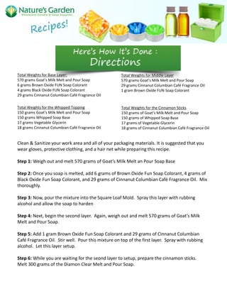 This document provides a recipe for making a 4-pound loaf of cinnanut coffee soap using goat’s milk melt and pour soap and various colorants and fragrance oils. It outlines step-by-step instructions for layering soap, creating cinnamon sticks, and finalizing the decoration. The recipe also includes necessary ingredients and equipment while noting that testing and compliance with regulations are the responsibility of the user.