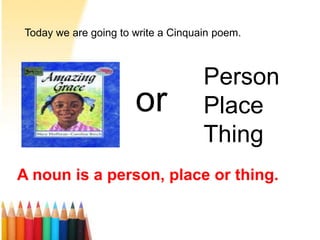 The document provides instructions for writing a cinquain poem, which is a five-line poem with a specific structure and style. It explains the parts of a cinquain poem and gives examples. It then outlines the writing process as brainstorming, drafting, revising, editing, and creating a final copy. Students are instructed to discuss their poem ideas with a friend and given a celebration link for more information on cinquain poems. Homework asks students to reflect on their poem and the writing process.