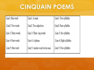 The document describes cinquain poems written by students in Room 15 at Greenpark School. One poem is about cats with 5 lines describing them as sneaky, lazy, sleeping and creeping while playing, chasing mice and birds, and being feline.