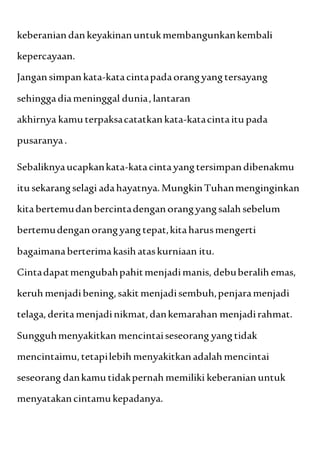 Teks ini membahas tentang cinta yang abadi dan sejati. Cinta seharusnya tidak pernah berakhir sampai salah satu pihak meninggal, dan perasaan cinta itu sebaiknya diungkapkan sekarang juga selagi masih ada kesempatan. Cinta yang tulus akan selalu ada walaupun seringkali diuji dengan kekecewaan.