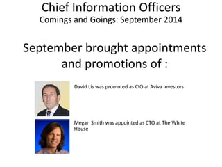 In September 2014, there were several changes to Chief Information Officer and Chief Technology Officer positions. David Lis was promoted to CIO of Aviva Investors. Megan Smith was appointed CTO of The White House. Chase Hafner resigned as CIO of Sweetwater Co School Dist1. Robert Dolin retired as CTO of Echelon Corporation.