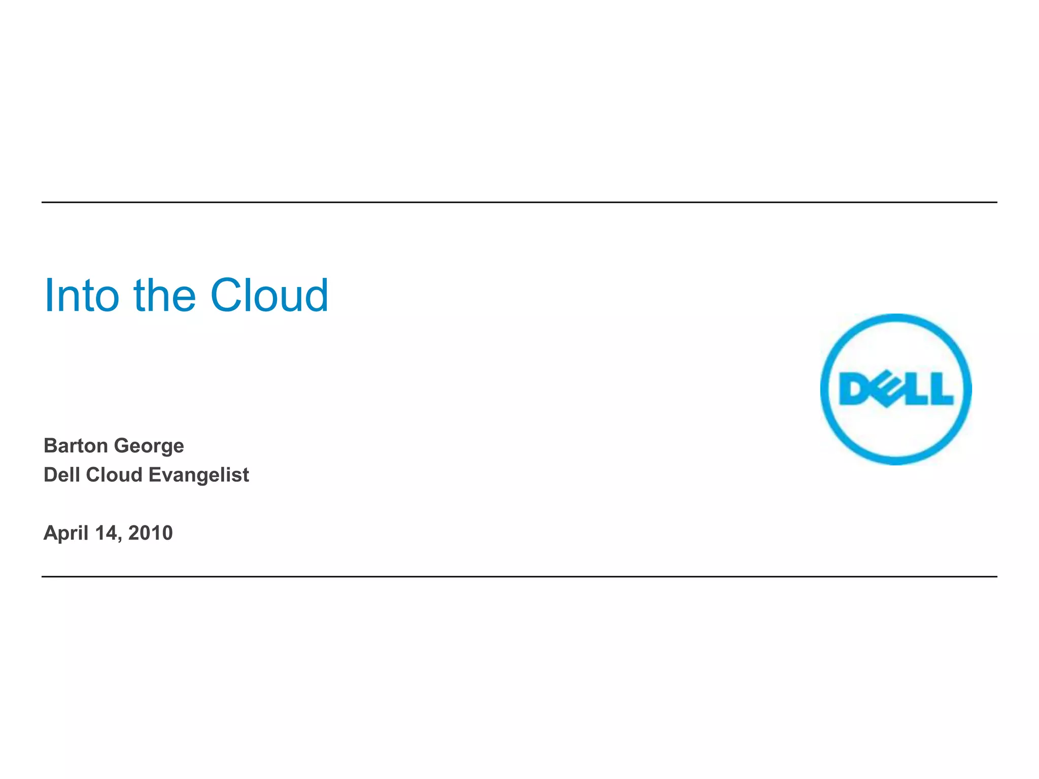 The document discusses cloud computing and provides Dell's definition of cloud characteristics. It notes that cloud computing allows for greater responsiveness to business needs while driving efficiencies. The document outlines different types of clouds including software as a service, platform as a service, and infrastructure as a service. It also discusses delivery methods such as private, public, and hybrid clouds. The document advises that IT departments should lead their organizations in cloud adoption to remain relevant. It provides recommendations for getting started with cloud computing through both evolutionary and revolutionary approaches.
