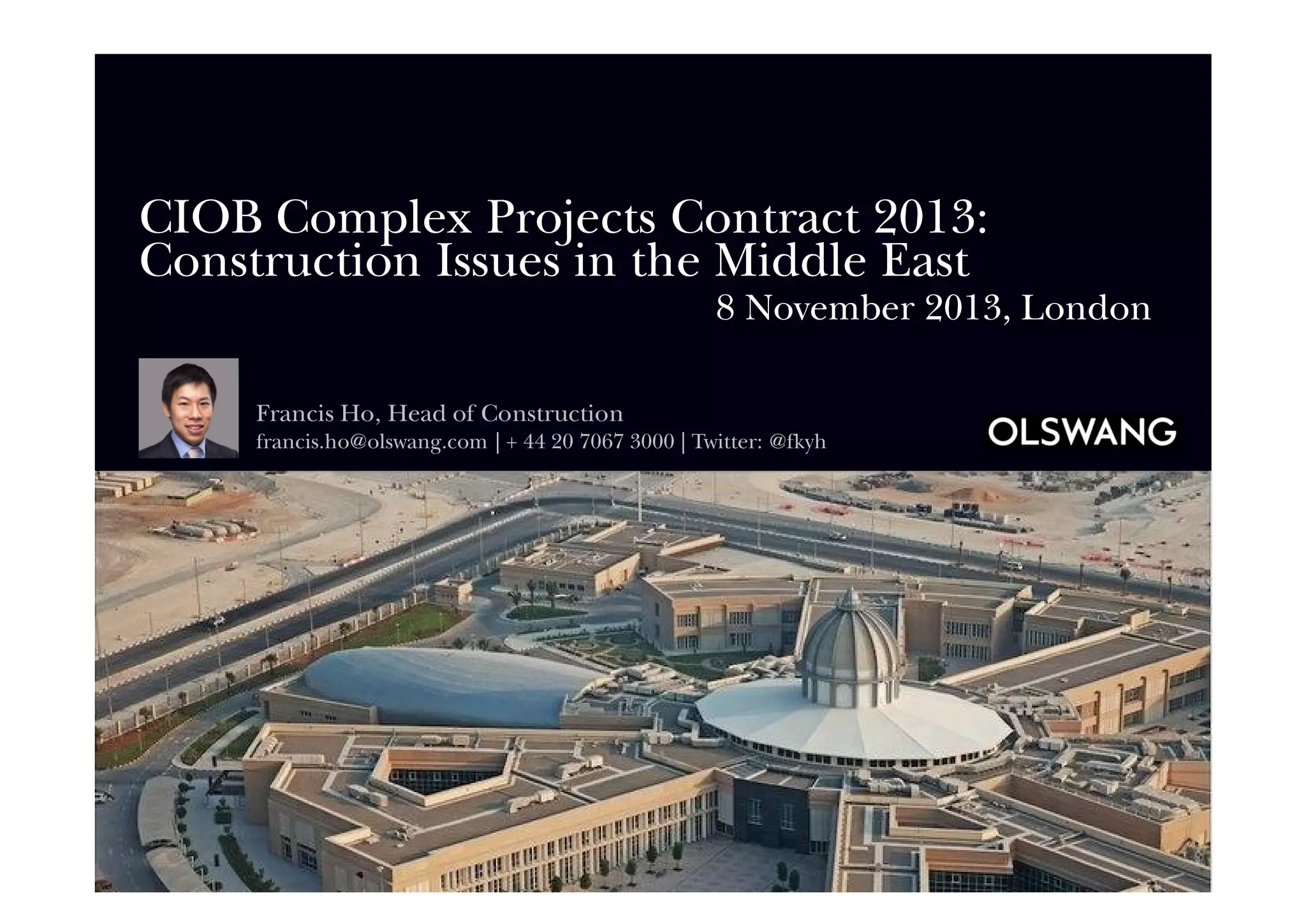 This document discusses construction issues related to complex projects in the Middle East. It notes that while the CIOB Complex Projects Contract 2013 has international and common law roots, provisions allow for compliance with local laws and requirements. Special conditions can further modify the contract to suit local markets. The document also outlines considerations for local sponsors, contractors, and split EPC contracts, highlighting potential impacts of local content rules, joint venture requirements, religious holidays, and tax advantages. It concludes with discussions of contract administration expectations and managing disputes in international projects.