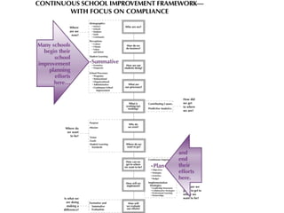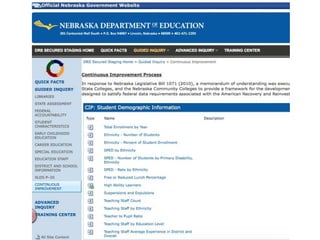 This document discusses using different types of data for continuous school improvement, including perceptual data, student learning data, school process data, and demographic data. It outlines a statewide system in Nebraska to provide professional development training to analyze data at all levels, from school staff to statewide cadres. Key aspects of the data training include the four Nebraska Data Literacies: what do the data show, why might this be, how should we respond, and did our response produce results. The document also provides resources for perceptual data surveys available through the Nebraska Department of Education.