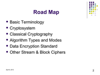 - Modern techniques like stream ciphers which encrypt bits one at a time using a pseudorandom keystream, and block ciphers which encrypt blocks of text.