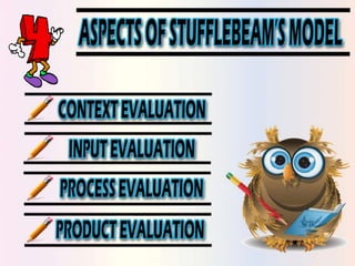 The document outlines the history and development of the CIPP (Context, Input, Process, Product) model for program evaluation. It describes the model's introduction in the 1960s and its refinement over several installments between 1966-1972 to include the four parts of context, input, process, and product evaluation. The current version from 2002 further aims to develop a coherent theoretical framework to guide evaluation.