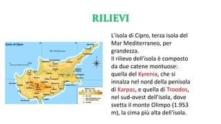 Cipro è la terza isola del Mar Mediterraneo e presenta due catene montuose principali: Kyrenia e Troodos. Il clima è mediterraneo-subtropicale, con estati calde e asciutte e inverni umidi; l'economia si basa principalmente sull'agricoltura, il turismo e il commercio, e il greco e il turco sono le lingue principali. La popolazione è per lo più di religione ortodossa, con una significativa presenza musulmana nel nord.