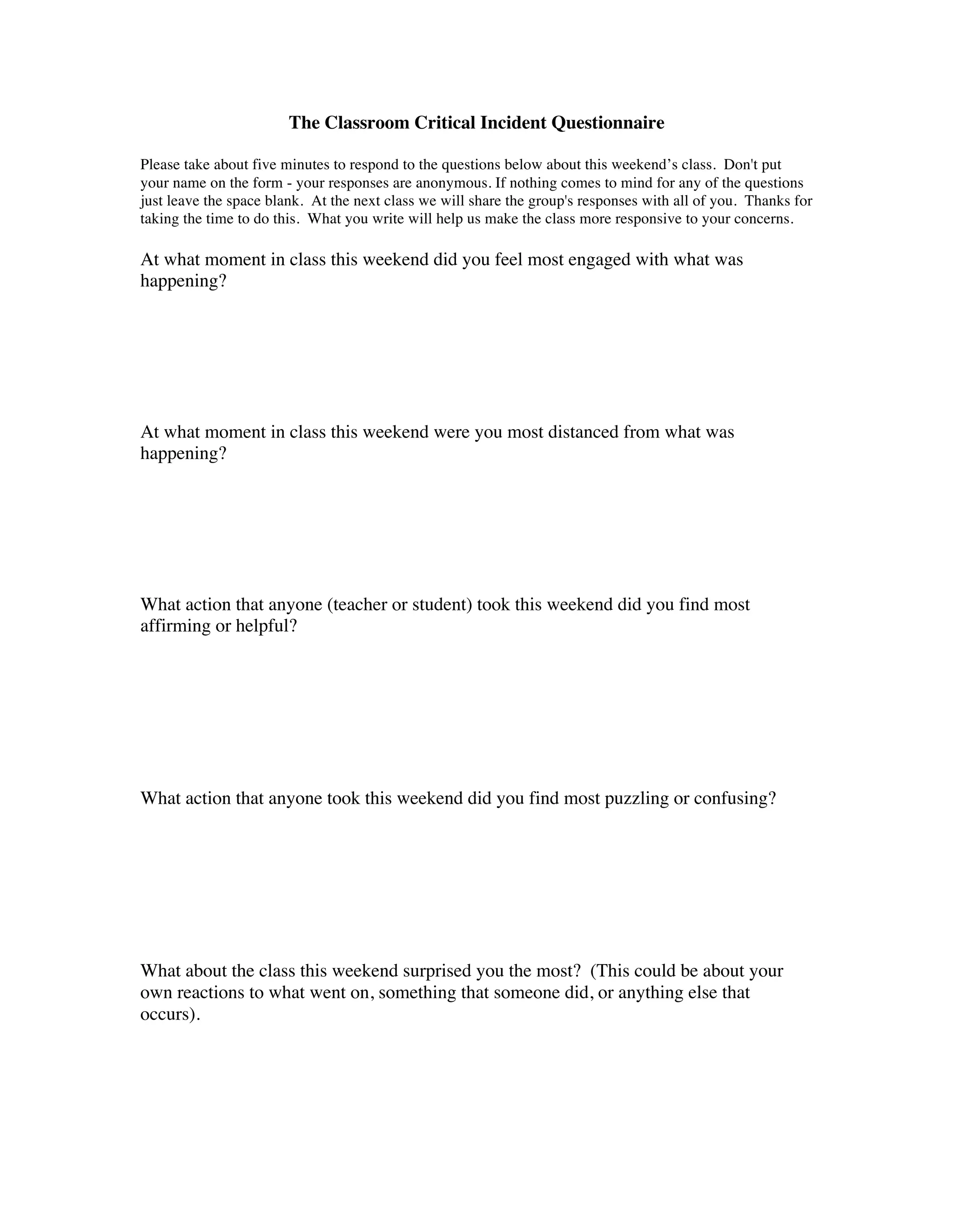 The document is a classroom critical incident questionnaire that asks students to anonymously reflect on a class weekend in 5 questions. It asks them to identify the moment they felt most engaged and distanced, the most affirming and puzzling actions, and anything surprising about their reactions or the class events. The questionnaire aims to get student feedback to help make the class more responsive to their concerns.