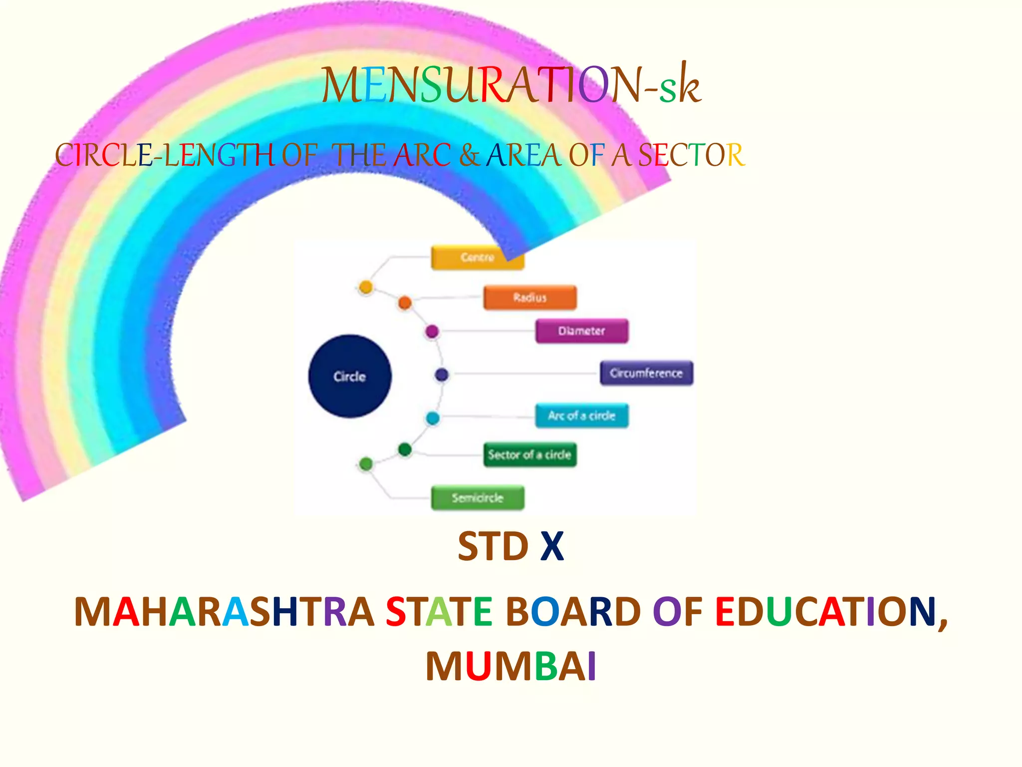 This document discusses circles, arcs, sectors, and how to calculate their properties. It defines a circle as all points equidistant from a center point, and an arc as a portion of a circle's circumference. The length of an arc is calculated by taking the ratio of the arc's central angle measure to 360 degrees and multiplying by 2πr. Similarly, the area of a sector is calculated by taking the ratio of its central angle measure to 360 degrees and multiplying by πr^2. Several examples are provided to demonstrate calculating arc lengths and sector areas.