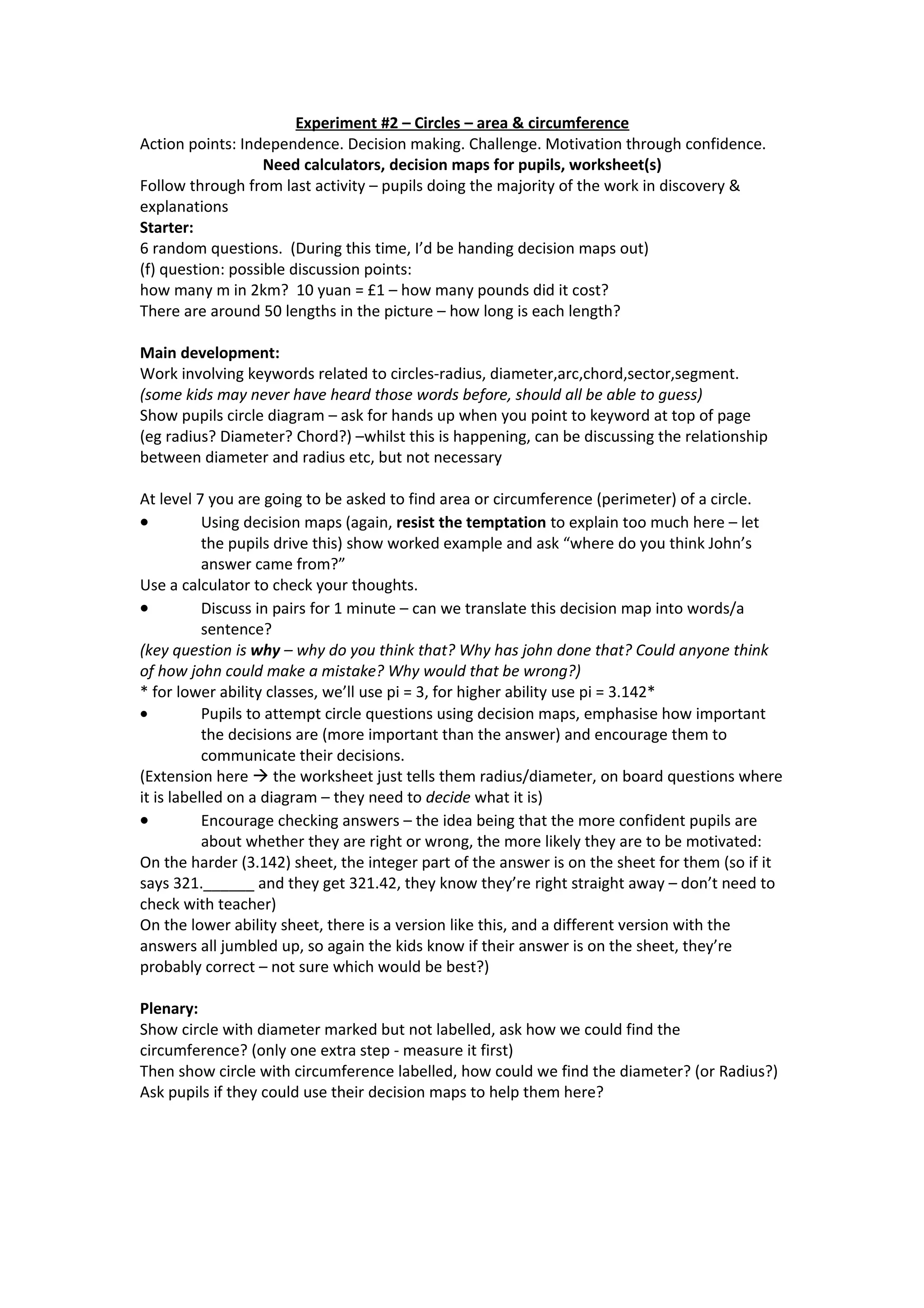 1) The document outlines an experiment involving teaching students about circles, including calculating their areas and circumferences.