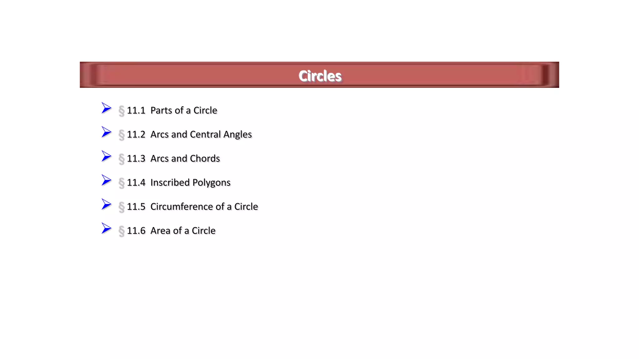 Circles  11.1 Partsof a Circle  11.4 Inscribed Polygons  11.3 Arcs and Chords  11.2 Arcs and Central Angles  11.6 Area of a Circle  11.5 Circumference of a Circle