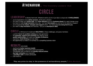 The document outlines Athenarium's Circle, a leadership mastermind program designed for business leaders facing significant challenges. It offers a supportive forum for problem-solving, access to peer relationships, expert coaching, and inspiration, resulting in improved business outcomes and personal motivation. The program is invitation-only and includes a pilot group launching soon, with membership options for early adopters and trusted development partners.