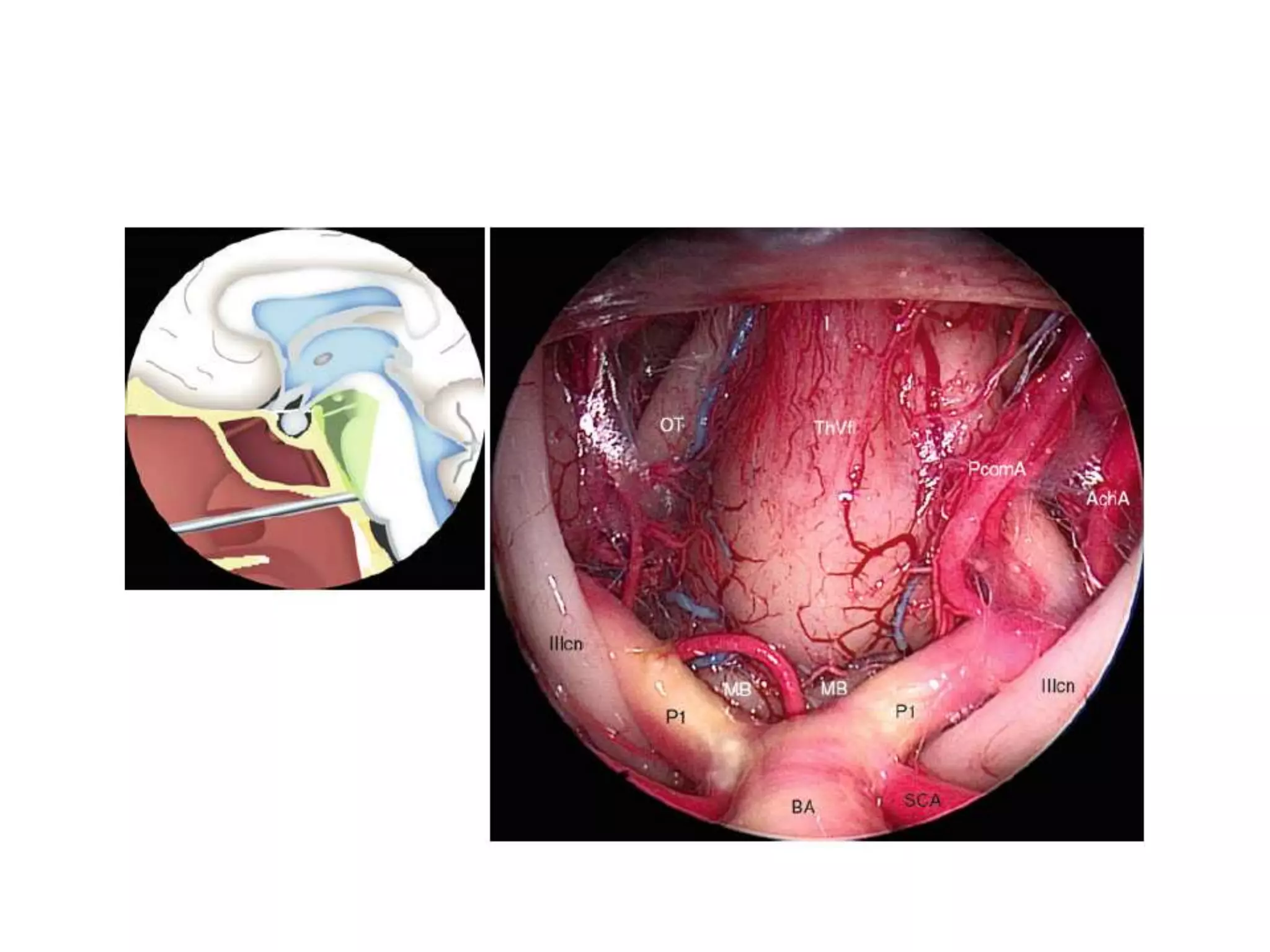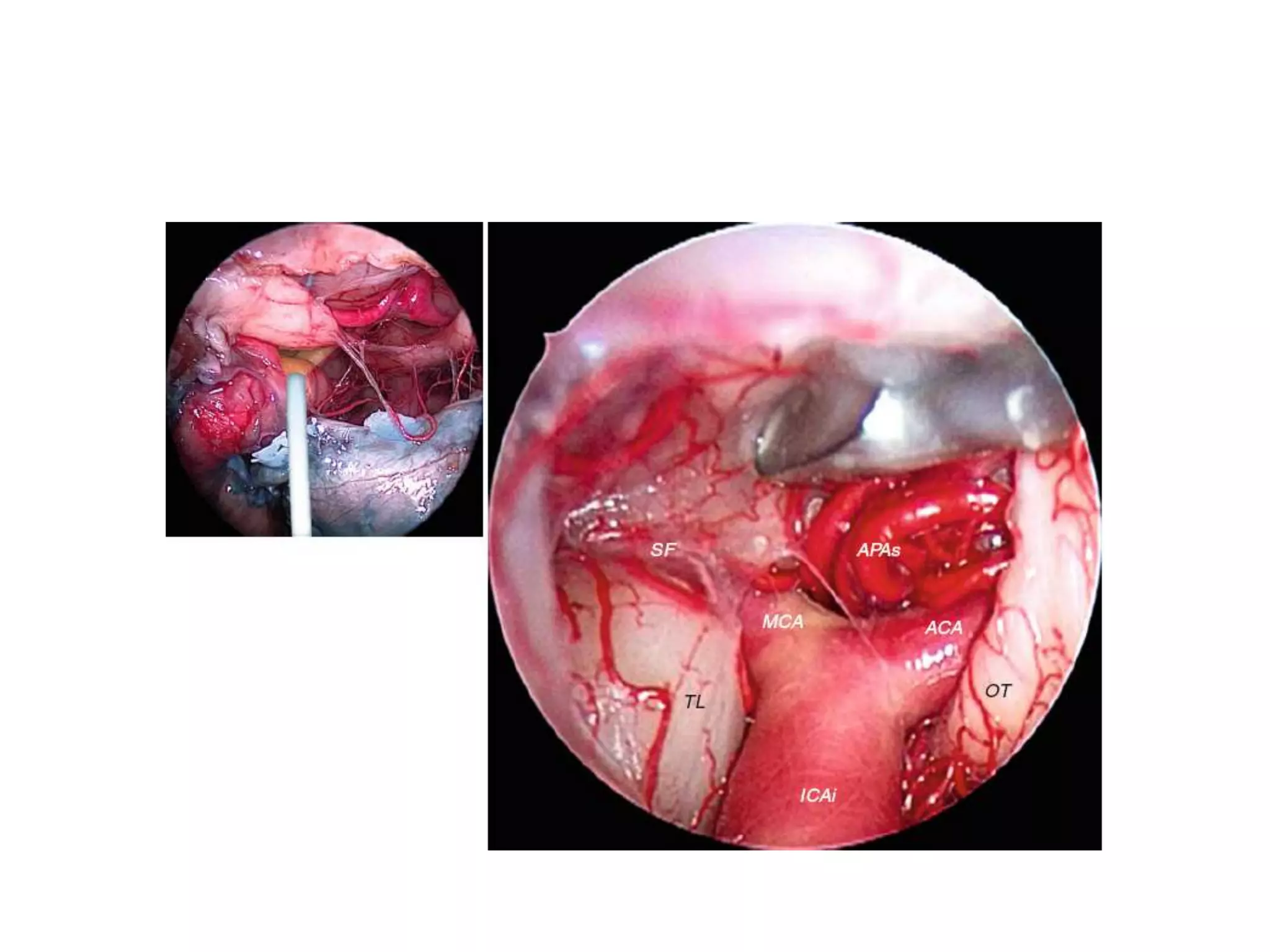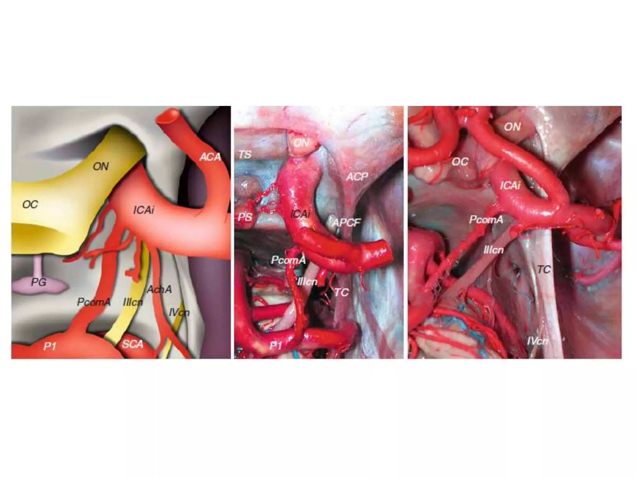 3. Images show views of the circle of Willis arteries that can be achieved through these approaches, such as the bifurcation of the internal carotid artery. Landmarks discussed include the optic nerves, carotid arteries, and anterior communicating complex.