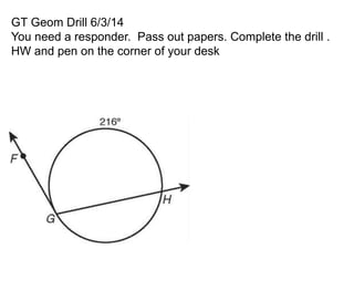 The document provides instructions for a geometry drill, asking students to pass out papers and complete the drill by finding specific values for angles and variables. Students are also told to have their homework and pen ready on their desk.