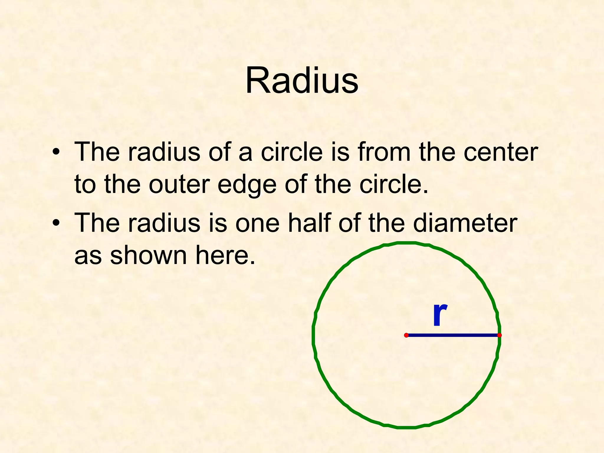- The radius of a circle extends from the center to the edge. The diameter spans across the circle. The diameter is twice the radius.
