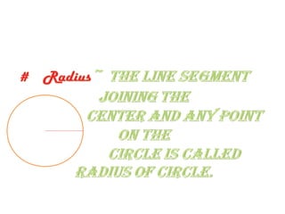 A circle is defined as the set of all points in a plane that are equidistant from a fixed point called the center. The diameter is the longest chord that passes through the center. An arc is a piece of the circle between two points, while the circumference is the length of the entire circle. A sector is the region between an arc and the two radii joining the center to the endpoints of the arc.