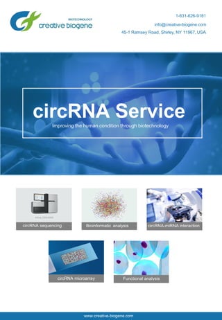 Creative Biogene is a global biotechnology company that offers high-quality circular RNA (circRNA) services to enhance biomarker discovery and drug development research. Their services include circRNA sequencing, microarray analysis, and bioinformatic support, with a focus on understanding circRNA's role as a miRNA sponge and in various biological functions. The company emphasizes that their analyses are for research use only and not for diagnostic procedures.