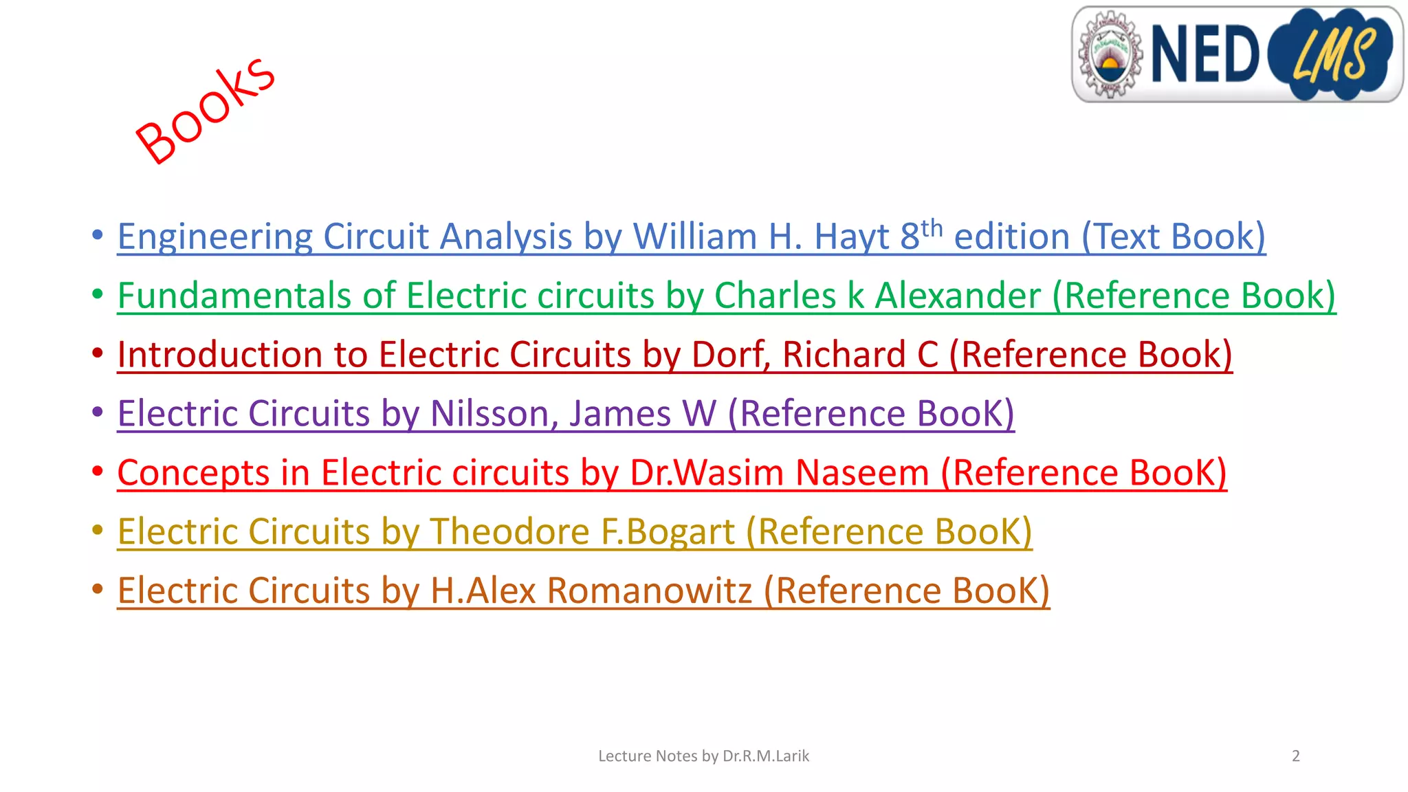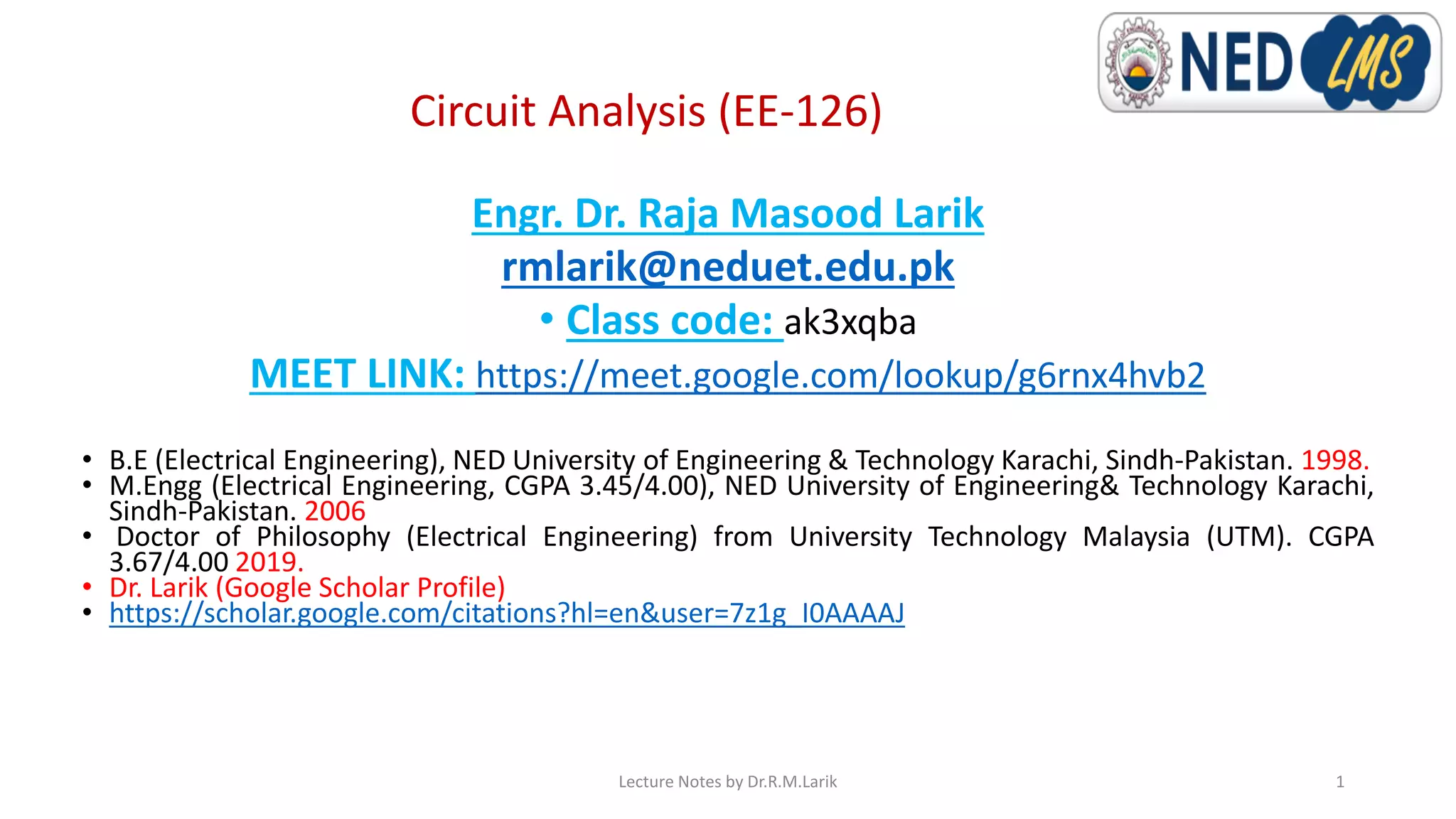 This document contains lecture notes for a Circuit Analysis course taught by Dr. Raja Masood Larik. It includes information about the instructor's educational background and research interests. The notes cover topics like polyphase circuits, three-phase generation and different three-phase connections including wye-wye, delta-delta, wye-delta and delta-wye. Diagrams are provided to illustrate balanced and unbalanced systems as well as how voltage and current values differ between line and phase quantities depending on the type of connection.