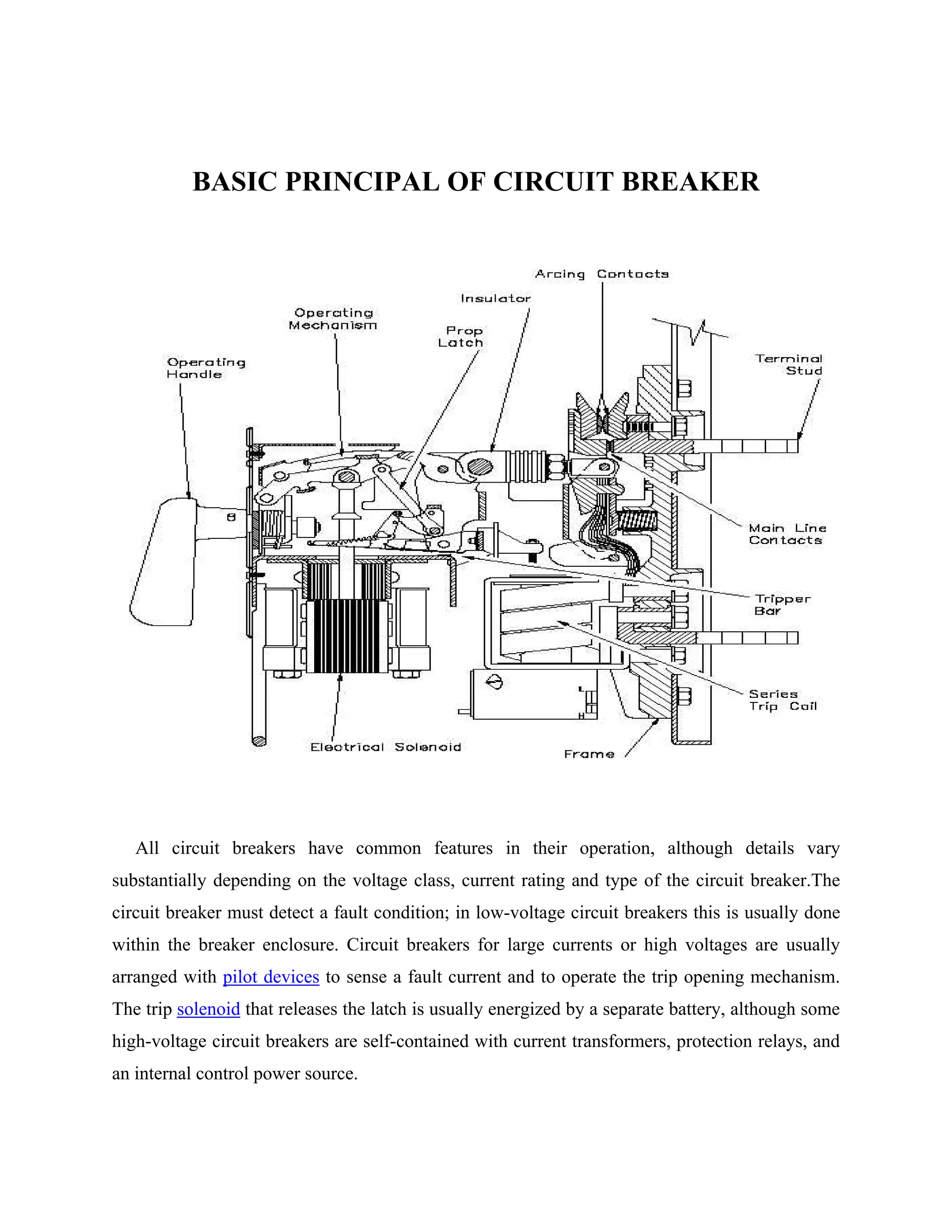 A circuit breaker is a device used to protect electrical circuits from damage caused by short circuits or overloads. It functions by automatically opening a circuit when excess current is detected. When a fault occurs, the circuit breaker detects it and uses stored mechanical energy to separate its contacts, interrupting the current. This creates an electric arc that must be contained and extinguished in a controlled way before the contacts can be re-closed to restore power. Common circuit breaker components detect faults, open contacts, extinguish arcs through techniques like lengthening or splitting it, and reclose contacts once faults have cleared.