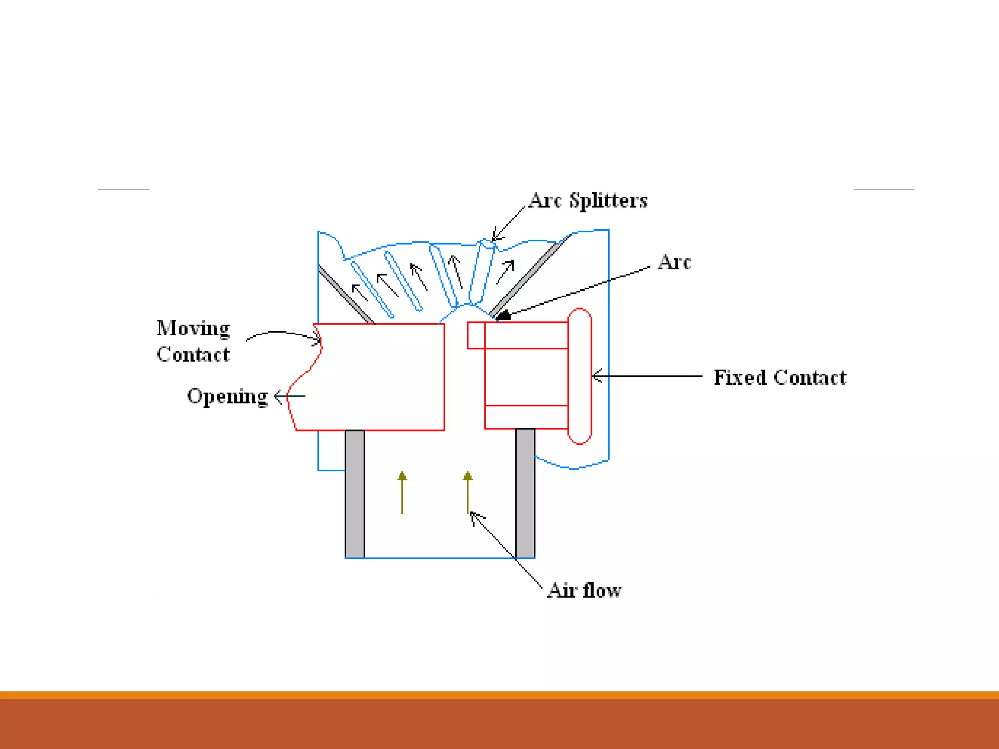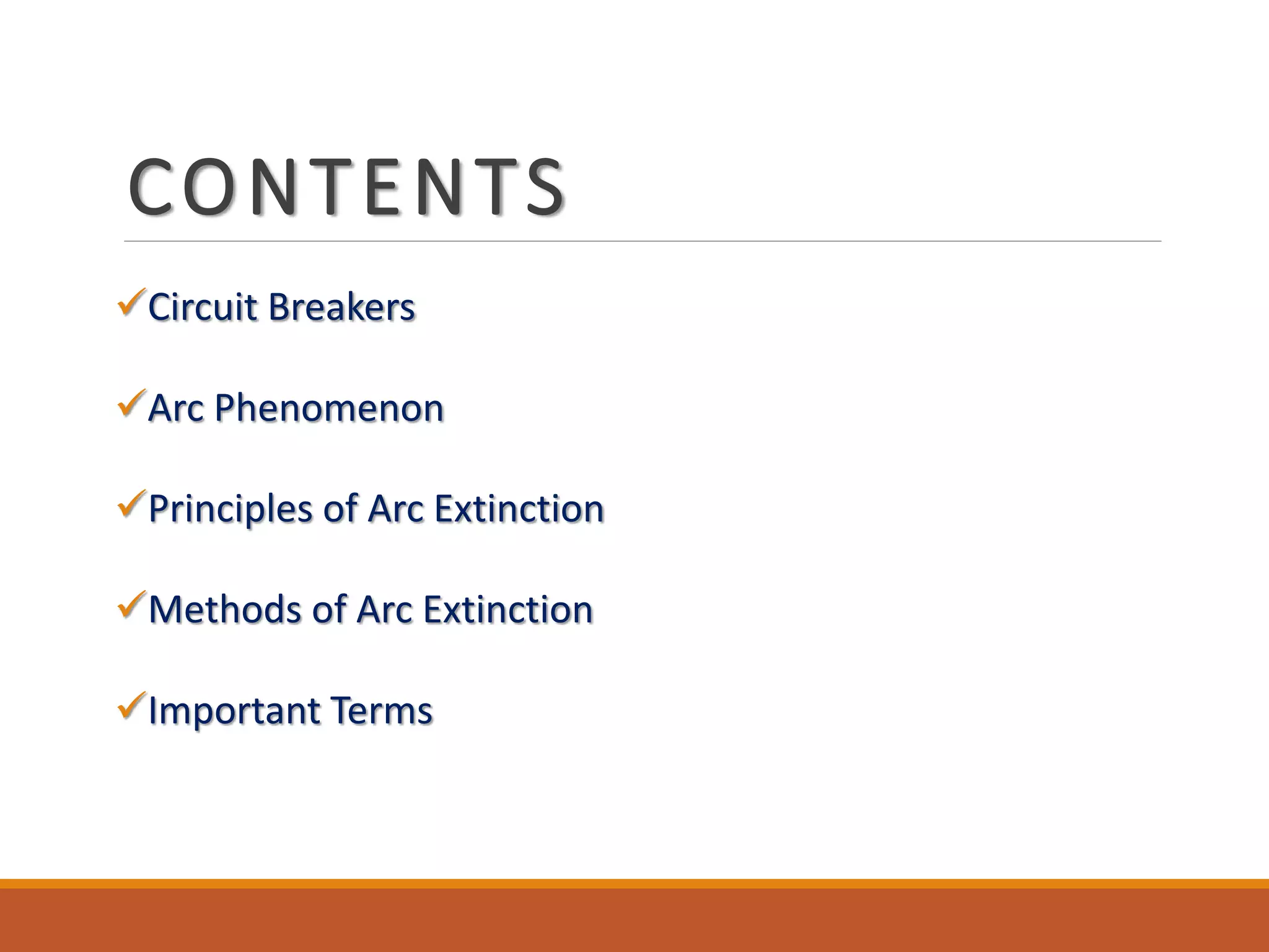 Circuit breakers are used to break electric circuits either manually or automatically during faults. When contacts open under a fault, an arc is produced which must be quickly extinguished. There are two main methods: the high resistance method increases arc resistance over time to reduce current below the level needed to sustain the arc, such as by lengthening, cooling, or splitting the arc. The low resistance or current zero method keeps arc resistance low until current reaches zero, then rapidly deionizes the medium between contacts to prevent the arc from restarting when voltage rises again.