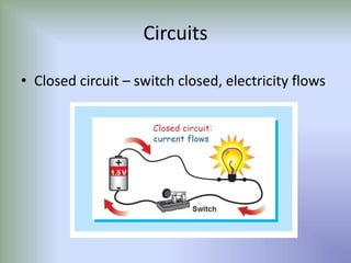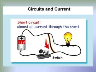 This document discusses different types of circuits including closed and open circuits, circuit diagrams, common circuit symbols, series and parallel circuits, and short circuits. It explains that closed circuits allow electricity to flow while open circuits do not. Series circuits have a single path for current to flow and if any part fails the entire circuit fails, while parallel circuits have multiple independent paths so if one fails the others still work. Short circuits bypass devices and drain batteries faster while risking fires from overheating wires.
