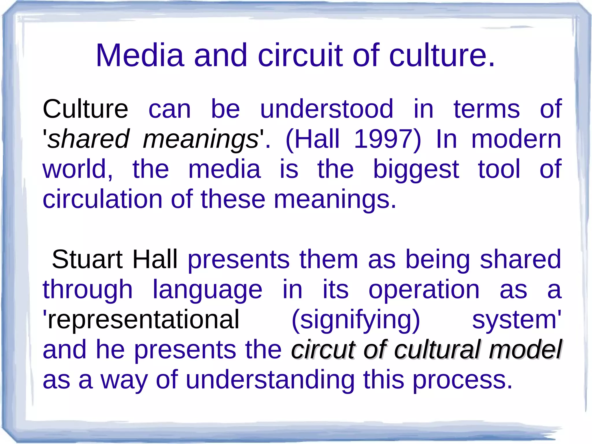 This document discusses Stuart Hall's circuit model of communication and culture. It explains that culture involves shared meanings that are circulated through media. Hall's circuit model shows how cultural meaning is generated and shaped at five moments: representation, identity, production, consumption, and regulation. The model also emphasizes that meaning is context-dependent and can vary between creator, text, and audience. Examples are provided to illustrate how representations can take on different meanings in different cultural contexts.