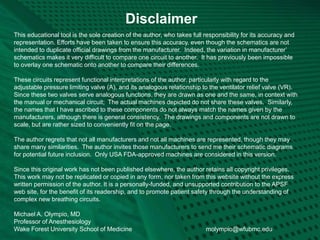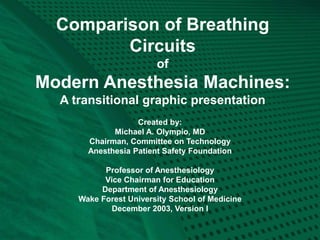 This document provides a comparison of breathing circuits used in modern anesthesia machines. It includes 13 diagrams of different circuit configurations, beginning with a conventional manual circuit and transitioning to more modern mechanical ventilation circuits. Each circuit diagram is accompanied by an explanation of how it functions. The document aims to help readers understand the complexities and variations in modern breathing circuit design. It was created by an anesthesiology professor as an educational tool.