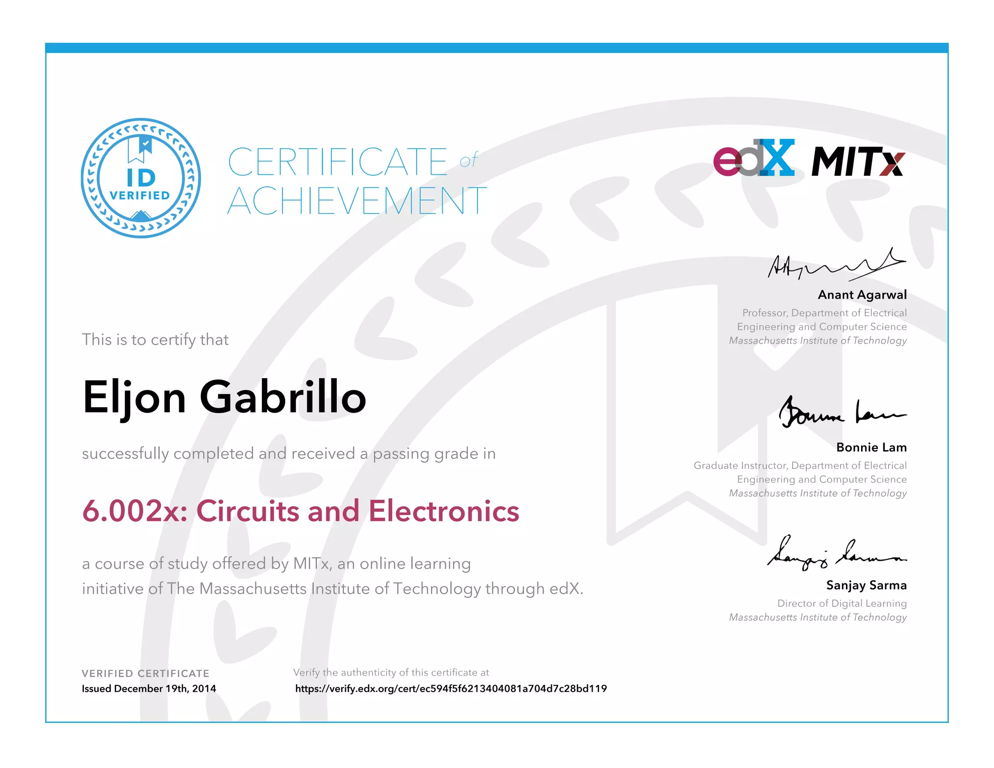 Eljon Gabrillo has successfully completed the online course '6.002x: Circuits and Electronics' offered by MITx through edX. The course is related to the Department of Electrical Engineering and Computer Science at the Massachusetts Institute of Technology. This certificate, verified by Anant Agarwal, Bonnie Lam, and Sanjay Sarma, was issued on December 19, 2014.