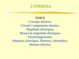 L'ENERGIA ELÈCTRICA. La matèria està composta per molècules i aquestes per àtoms. Els àtoms , a la vegada, estan formats per un nucli i una escorça . El nucli consta de partícules amb activitat elèctrica neutra anomenades neutrons i altres amb càrrega elèctrica positiva, anomenades protons . L'e scorça és un espai al voltant del nucli en el que, en diferents capes o òrbites, es mouen unes partícules amb càrrega elèctrica negativa, anomenades electrons. Índex L'energia elèctrica és la que es produeix en determinades matèries pel moviment, des d'uns àtoms a altres, dels electrons situats en la capa més externa de l'escorça.