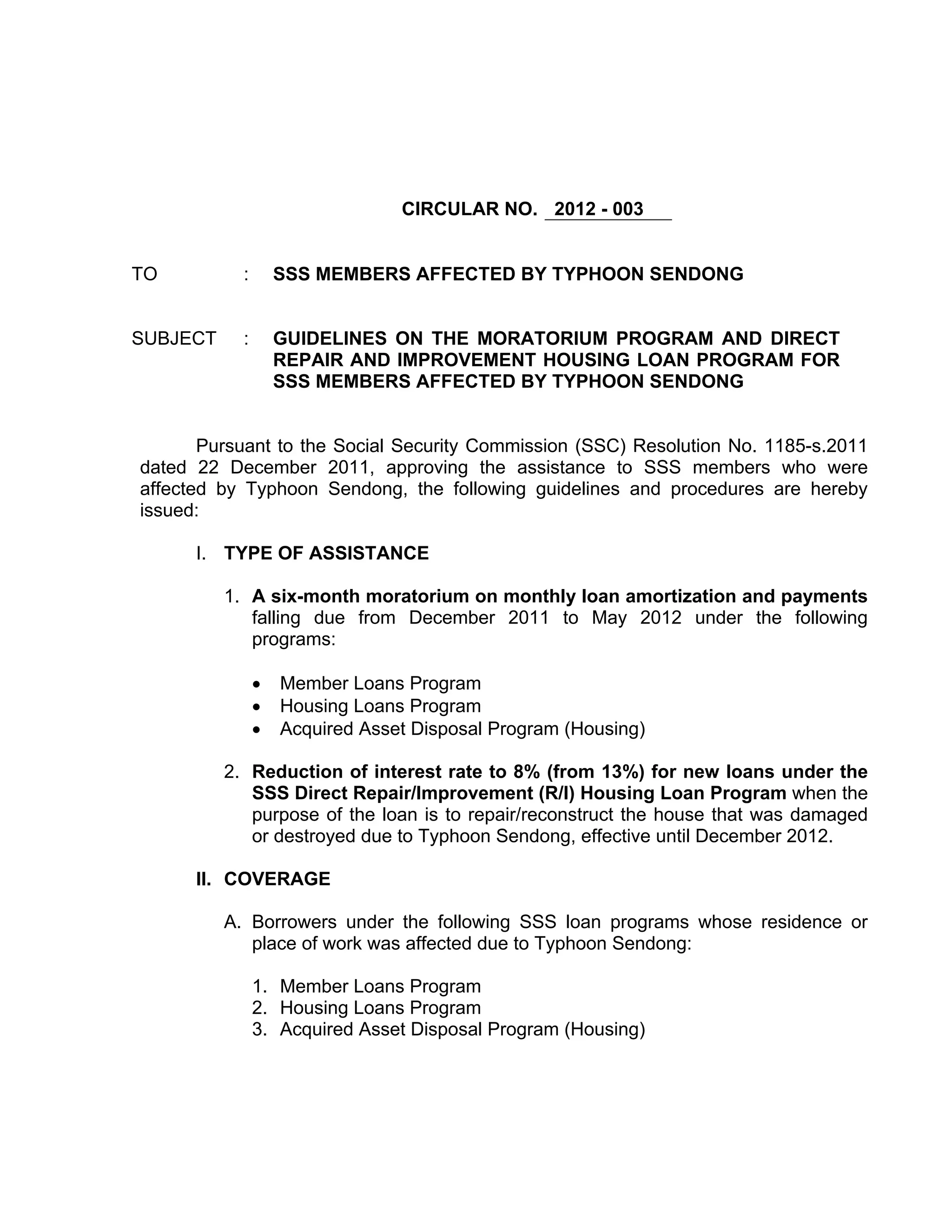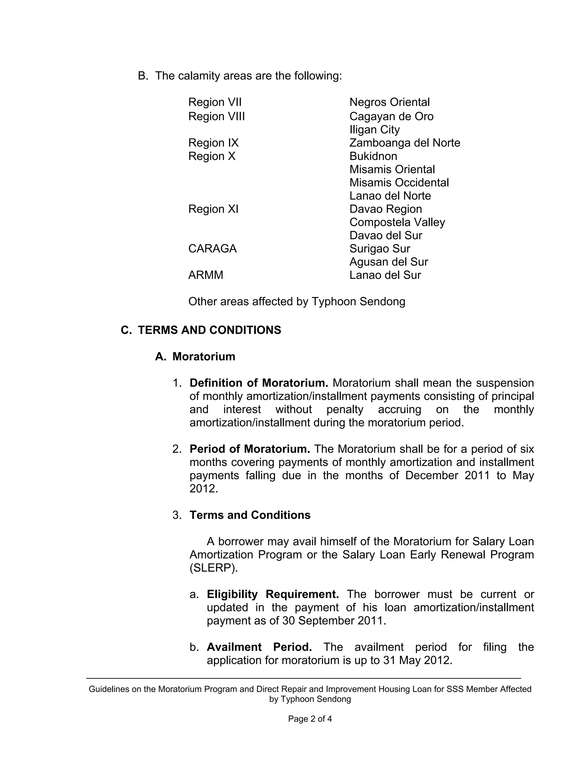 This document outlines guidelines for a moratorium program and direct housing repair loan assistance for SSS members affected by Typhoon Sendong. It includes a six-month suspension of loan amortizations and a reduction of interest rates for repair loans to 8% for those whose homes were damaged. The assistance is available to eligible borrowers in specific calamity areas until June 2012, with detailed application requirements provided.