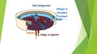 The document discusses clarifiers, which are settling tanks used to remove solids from liquid through sedimentation. There are two main types of clarifiers: rectangular and circular. Clarifiers work by allowing heavier solids to settle to the bottom while lighter materials such as scum float to the surface. Primary clarifiers are used to remove solids before biological wastewater treatment, typically removing 90-95% of settleable solids. Secondary clarifiers separate treated wastewater from activated sludge after biological processes. Design considerations for clarifiers include hydraulic loading, solid loading, detention time, and surface overflow rate.