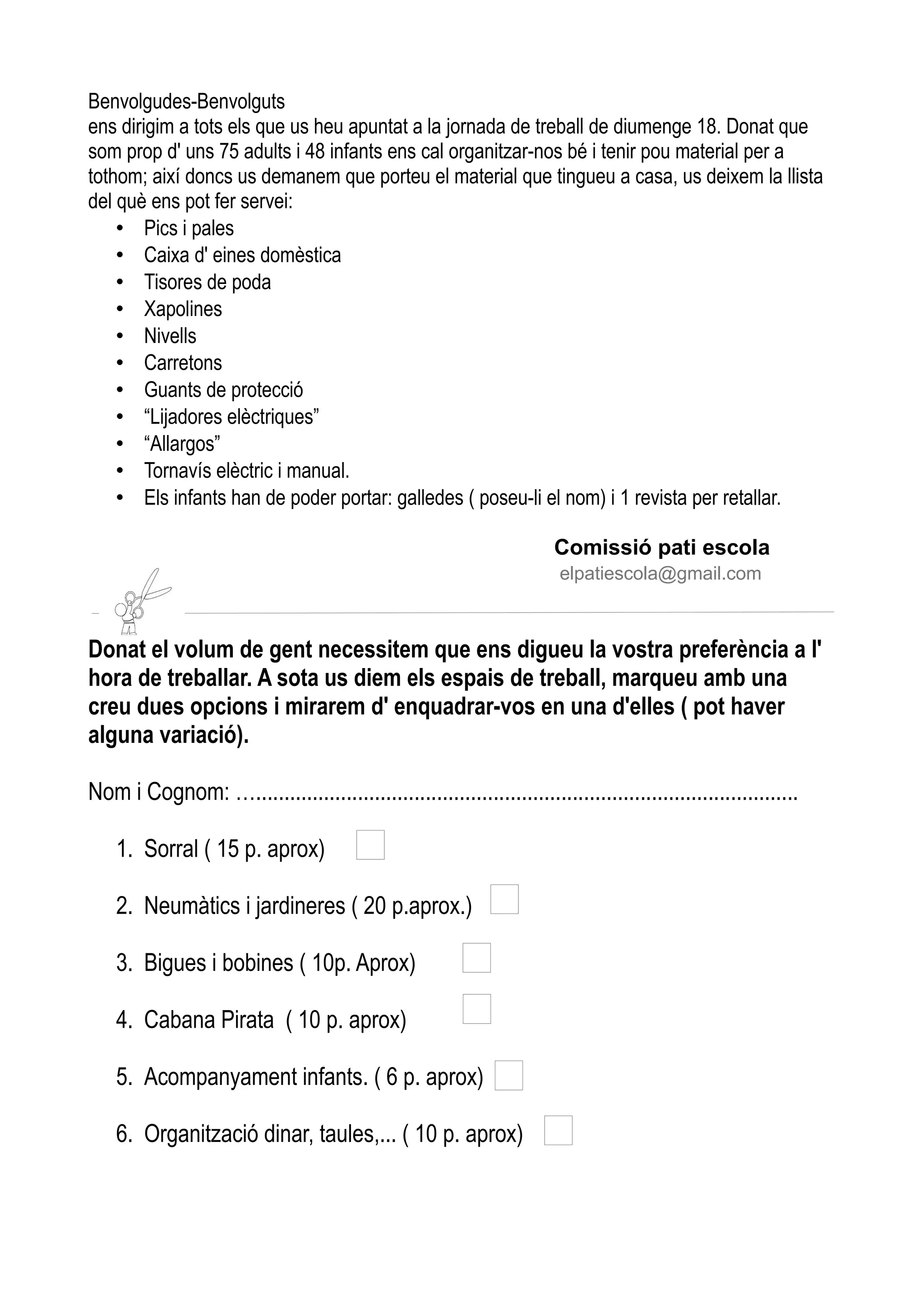 • Els infants han de poder portar: galledes ( poseu-li el nom) i 1 revista per retallar.