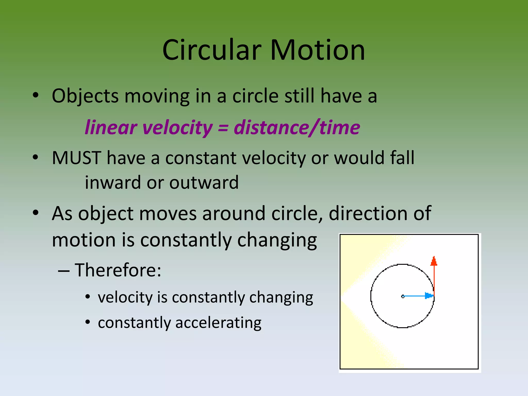 Objects moving in a circular path have a constant linear velocity but are constantly accelerating because their direction of motion is continuously changing. Centripetal acceleration points toward the center of the circle and depends on an object's speed and the radius of the circle. For an object to travel in a circular path, a net centripetal force pointing toward the center of the circle must be applied to overcome the object's inertia. Examples of circular motion include boats on waves, objects on strings, orbital motion of planets, and the rotation and revolution of Earth.