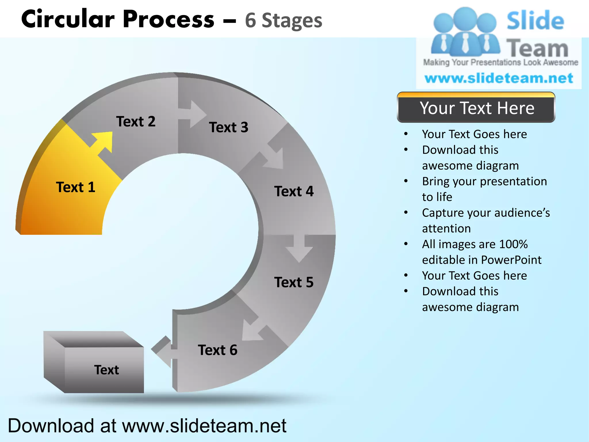 The document describes a circular process diagram with 6 stages. It encourages downloading an editable diagram from a website that can be customized with text and images to bring presentations to life and capture audiences' attention. The diagram and all images within can be fully edited in PowerPoint.