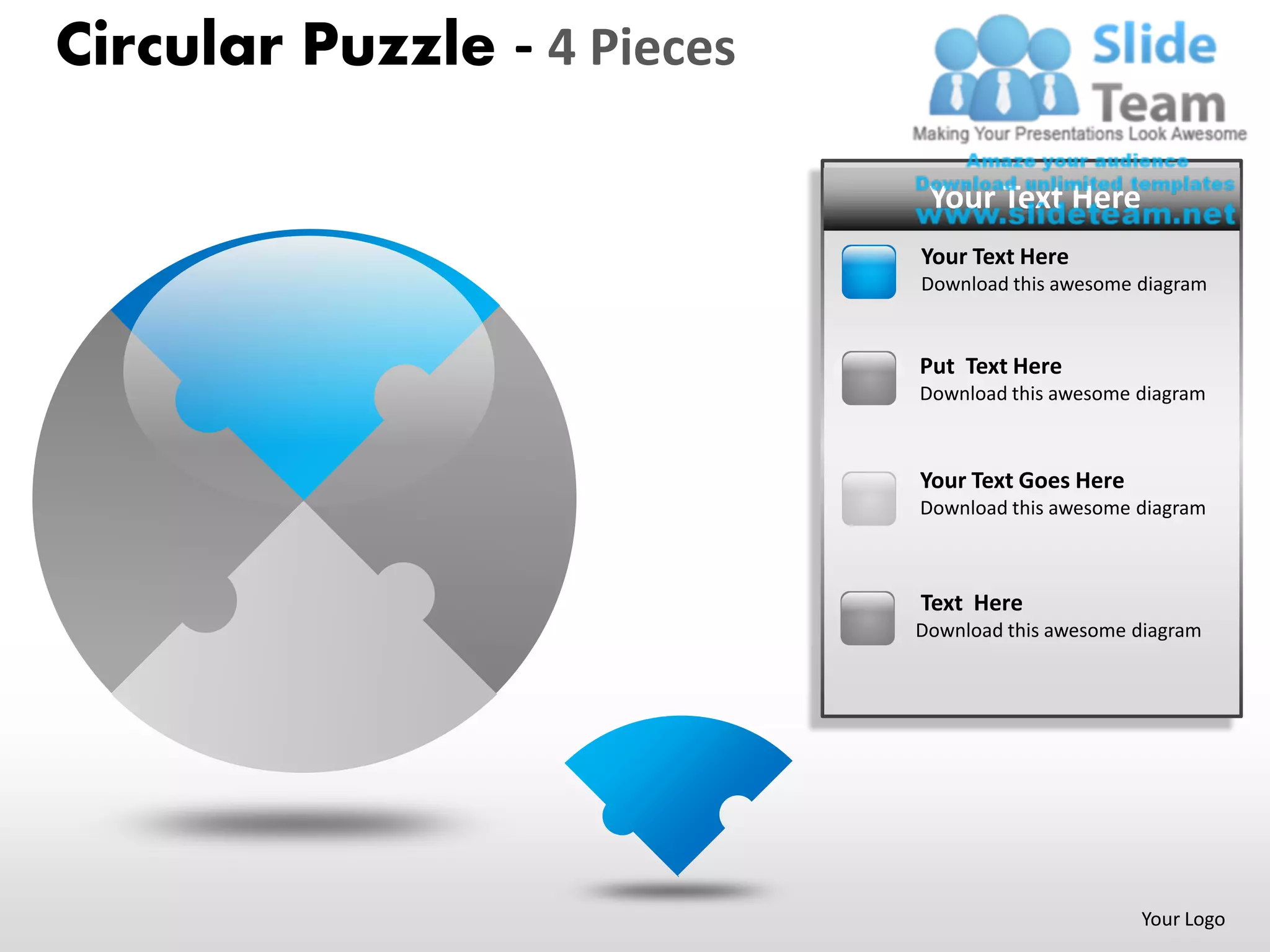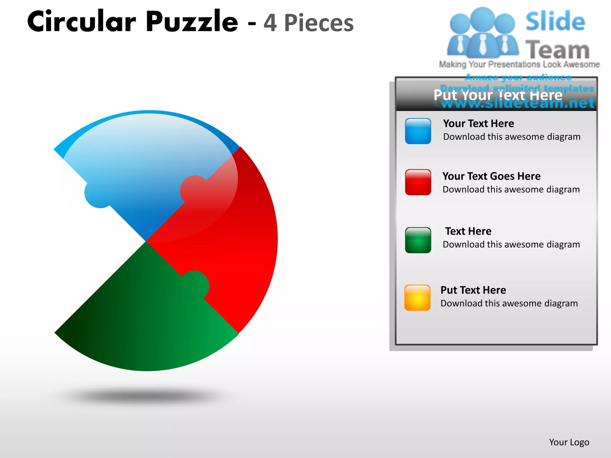 The document describes a circular puzzle with 4 pieces that can be arranged in different configurations. The pieces contain placeholder text that can be replaced with custom text. Additionally, logos can be added. Instructions are provided on how to ungroup objects to individually edit them and how to change the color of shapes. The purpose is to allow customizable circular diagrams to be created using the provided puzzle pieces.