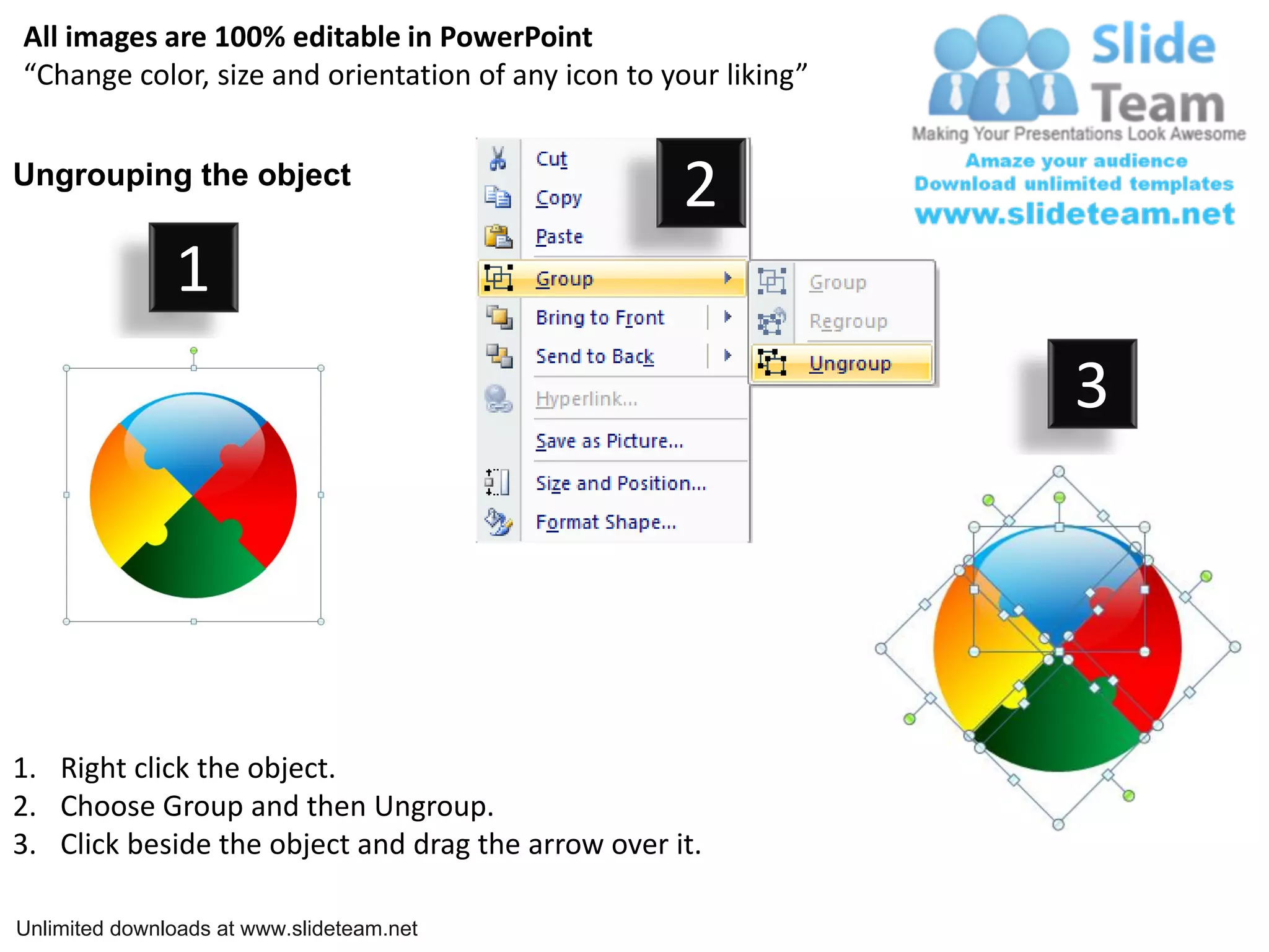 This document provides instructions for editing a circular puzzle diagram with 4 pieces. It describes how to ungroup the object so each piece can be edited individually. It also explains how to change the color of a selected shape by right clicking, choosing format shape, and selecting a new solid or gradient fill color. The document encourages downloading more editable images and diagrams from the provided website.