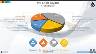 The document contains examples of various pie charts and circular charts displaying percentages and numerical data. There are 21 pages showing different pie chart and circular chart layouts that can be used in business presentations. The charts include editable templates for profit percentages over years, as well as charts imported from Excel displaying sales, revenue, and other financial metrics.