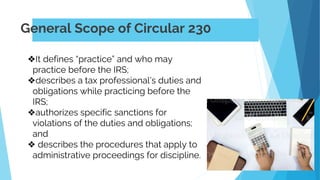 Circular 230 defines the rules and regulations governing practice before the Internal Revenue Service. It establishes who may practice, outlines practitioners' duties and obligations, authorizes sanctions for violations, and describes disciplinary procedures. The Office of Professional Responsibility is responsible for interpreting and enforcing Circular 230. It requires due diligence of practitioners in preparing accurate tax returns and representations. Specific areas like the earned income tax credit involve additional diligence requirements to address high error rates.