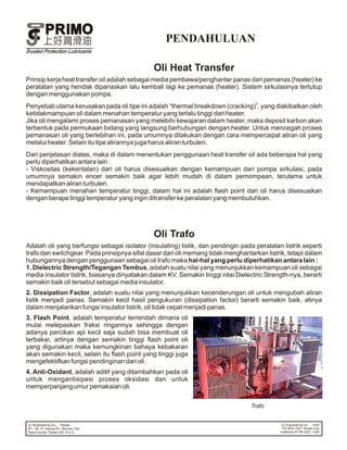Oli heat transfer digunakan sebagai isolator listrik dan pendingin pada peralatan listrik seperti trafo, dengan karakteristik penting yang harus diperhatikan termasuk dielectric strength, dissipation factor, flash point, dan penggunaan aditif anti-oksidan. Pada sistem sirkulasi, oli tidak hanya berfungsi untuk melumasi tetapi juga mendinginkan dan menghilangkan kontaminan, melibatkan peralatan seperti reservoir, pompa, dan pendingin. Pemilihan oli dan sistem pemurnian yang tepat sangat bergantung pada jenis peralatan dan kondisi operasi yang dihadapi.