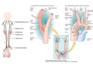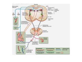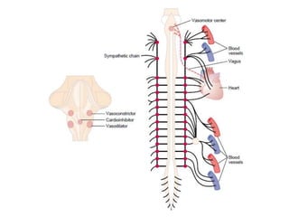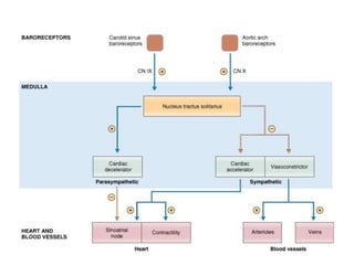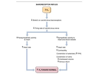 This document discusses veins, central venous pressure (CVP), microcirculation, lymphatics, local control of blood flow, arterial blood pressure control, cardiac output, and the relationship between the cardiovascular and lymphatic systems. Key points include that 60% of blood is in veins, CVP is measured invasively or noninvasively, capillary filtration is determined by Starling forces, blood flow is regulated locally and through neural and hormonal mechanisms, and cardiac output is determined by stroke volume and heart rate.