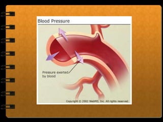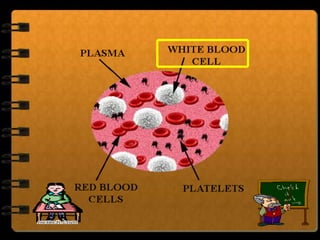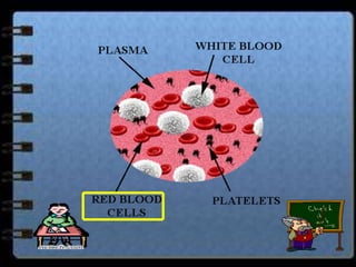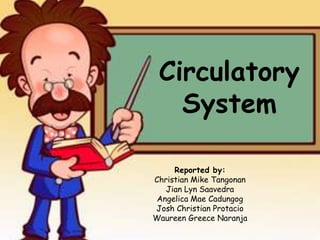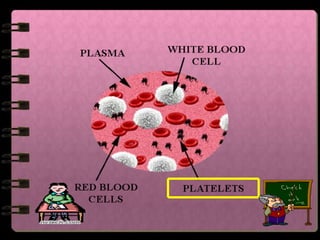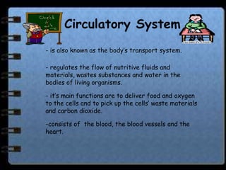 The circulatory system transports nutrients, gases, hormones, blood cells, and wastes to and from cells in the body. It consists of the heart, blood vessels, and blood. The document discusses the components and functions of the circulatory system, types of circulatory systems, blood and its components, blood vessels, the cardiac cycle, blood circulation, common diseases, and ways to care for the circulatory system.
