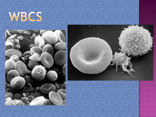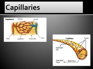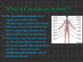 The circulatory system transports blood, nutrients, gases, and waste throughout the body via blood vessels and the heart. It is composed of the cardiovascular system including the heart, which pumps blood, and blood vessels. The heart has four chambers that receive and pump blood into and out of the lungs and body. Blood contains red blood cells, white blood cells, and platelets and carries oxygen, nutrients, hormones, and removes waste. It flows through arteries, capillaries, and veins.