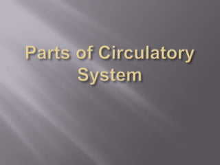 The circulatory system transports oxygen, nutrients, hormones, and waste products throughout the body via blood vessels. Blood is pumped from the heart through arteries to tissues, where nutrients and oxygen diffuse into cells and waste diffuses out. The blood then returns to the heart through veins, circulating to all parts of the body through this peripheral circulatory system.