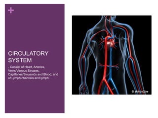 The circulatory system transports blood, nutrients, oxygen, hormones, and other materials throughout the body while removing wastes. It consists of the heart, arteries, veins, capillaries, lymph vessels, and blood. In most vertebrates, the heart has four chambers - two atria that collect blood and two ventricles that pump blood. The heart circulates blood through two circuits - the pulmonary circuit, which transports blood to the lungs to receive oxygen, and the systemic circuit, which transports oxygenated blood to the rest of the body. Over time, the vertebrate heart evolved divisions and modifications to more efficiently support gas exchange via lungs or other organs.