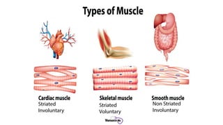 There are three main types of muscles in the body - smooth, skeletal, and cardiac. Smooth muscles are involuntary and work internally for digestion and excretion. Skeletal muscles are voluntary and attached to bones via tendons, allowing for movement. Cardiac muscle is involuntary and makes up the heart, contracting and relaxing to pump blood. The circulatory system moves blood around the body via arteries, veins, and capillaries. Blood carries oxygen, nutrients, wastes, and defenses. The heart pumps blood through two circulations - to the lungs and throughout the body. Regular exercise and a healthy diet help maintain a healthy circulatory system.