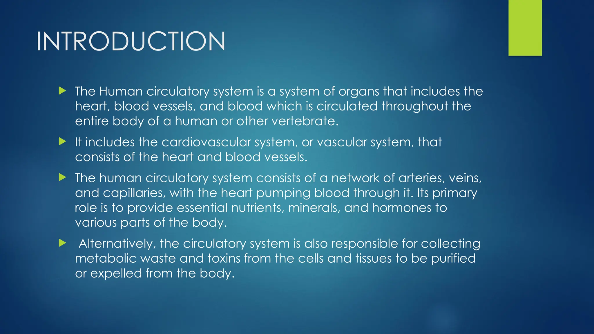 The human circulatory system comprises the heart, blood, blood vessels, and the lymphatic system, functioning to circulate essential nutrients and eliminate waste. The heart pumps oxygen-rich blood through arteries while veins return oxygen-poor blood, maintaining a closed system critical for body function. Blood consists of red and white blood cells, platelets, and plasma, each playing vital roles in transport, regulation, and protection of the body.