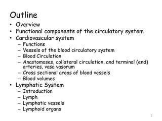 The circulatory system consists of the cardiovascular system and lymphatic system. The cardiovascular system includes the heart and blood vessels that circulate blood throughout the body. It transports oxygen, nutrients, hormones, and immune cells and removes carbon dioxide and wastes. The circulatory system is divided into the systemic and pulmonary circuits. Arteries branch into smaller arterioles and capillaries, where gas and nutrient exchange occurs, before venules and veins return blood to the heart. The lymphatic system drains excess fluid from tissues and transports it back to the bloodstream.