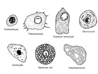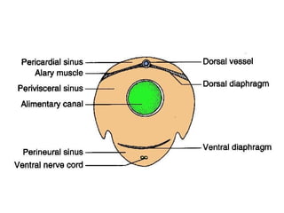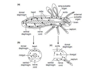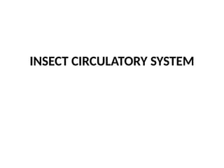 Insects have an open circulatory system where blood (haemolymph) flows through a body cavity called haemocoel and is divided into three sinuses. The main organ for circulation is the dorsal blood vessel, which has openings called ostia to prevent backflow, and the blood contains various components including plasma and haemocytes. Haemolymph functions include lubrication, transportation of nutrients, protection against pathogens, regulation of body temperature, and maintenance of osmotic pressure.